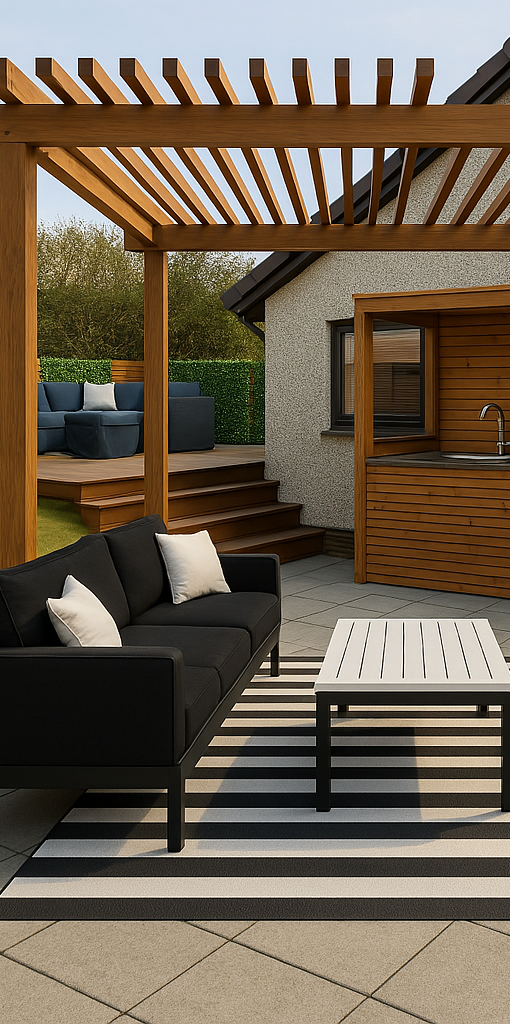 A modern outdoor kitchen and lounge deck designed for both, function and relaxation. Featuring warm wood tones, open-slat pergola, and sleek black and white seating, the space blends contemporary design with natural textures-creating a stylinsh yet inviting setting for outdoor entertaining.