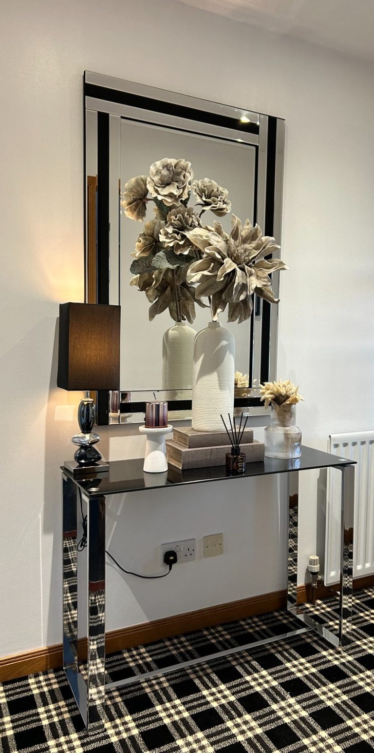 This entrance sets the tone with understated elegance- layered books, statement florals and warm lighting combine to create a welcoming yet polished first impression.